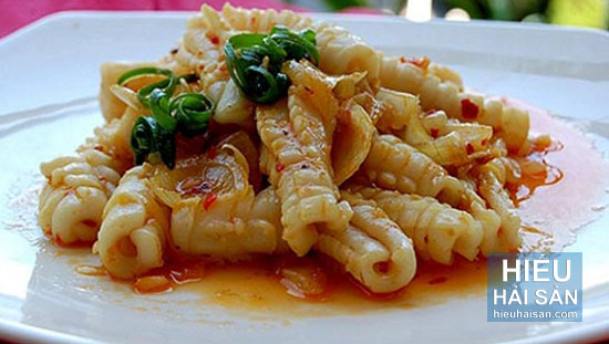 – Phi thơm hành tỏi băm nhỏ rồi cho mực vào xào lớn lửa đến khi mực săn lại thì thêm hành tây vào xào cùng khoảng 3 phút. Nêm nếm lại gia vị cho vừa ăn rồi tắt bếp.