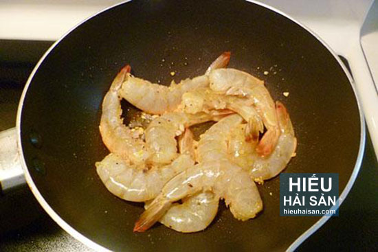 - Cho chảo lên bếp, làm nóng dầu, phi thơm tỏi băm, tiếp theo cho tôm vào rim với lửa lớn, tôm chuyển sang màu đỏ là được.