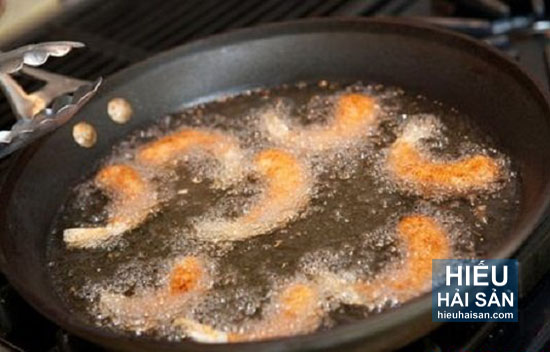 - Đun dầu nóng, cho tôm vào chiên vàng 2 mặt.