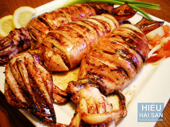 – Bày mực nướng ra đĩa, dùng nóng cùng với bí nướng và dưa chua ngọt rất ngon miệng.